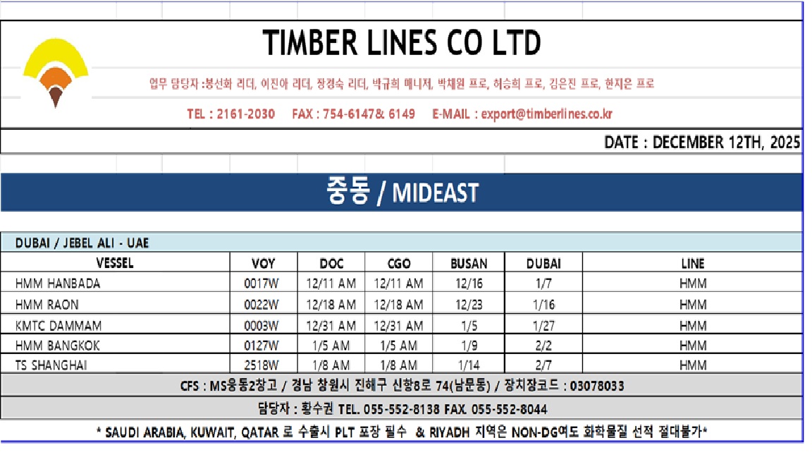 팀버라인의 수출입 업무 스케쥴입니다.